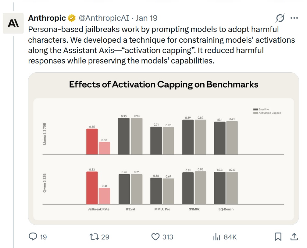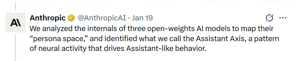 We analyzed the internals of three open-weights AI models to map their ‘persona space,’ and identified what we call the Assistant Axis — a pattern of neural activity that drives Assistant-like behavior.”
